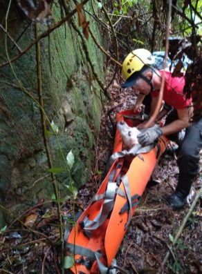 A equipe de resgate encontrou o cachorro percorrendo uma trilha de aproximadamente 500 metros. Devido à dificuldade de acesso, uma moradora abriu um novo caminho pela ribanceira, com cerca de 40 metros, permitindo que o animal fosse retirado com segurança. Bob foi estabilizado na maca envelope (sked) antes de ser entregue ao tutor.