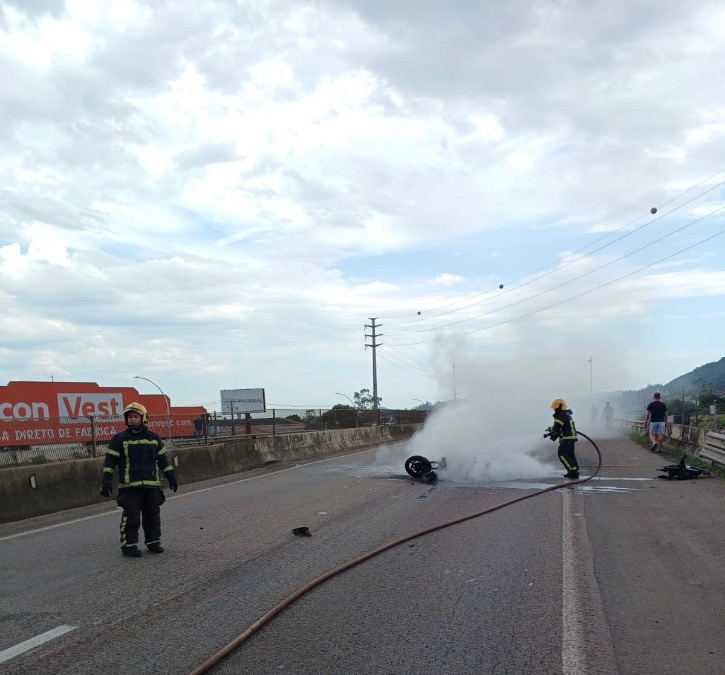 Um motociclista ficou ferido após um acidente que resultou em incêndio na tarde deste sábado (4) na BR-101, em Tubarão, no bairro São Cristóvão.