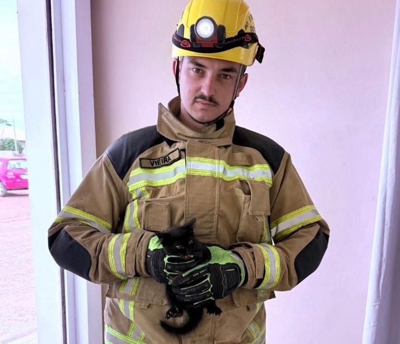 Com cuidado e técnica, a equipe conseguiu retirar o gatinho em segurança.