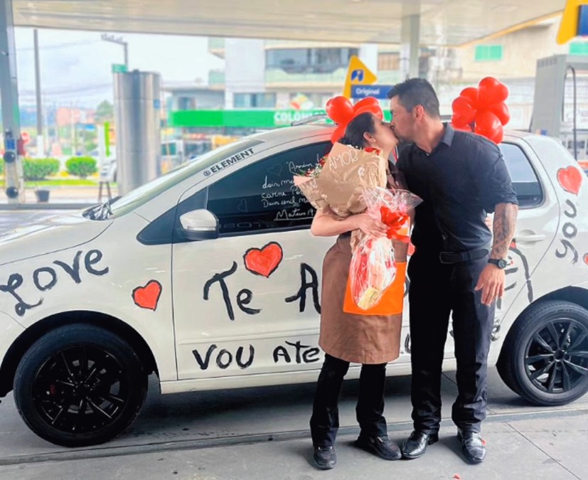 De carro todo pintado com mensagens apaixonadas, buquê de flores nas mãos e presentes cuidadosamente escolhidos, Eliseu foi até o posto de combustíveis onde Germania trabalha e fez uma verdadeira declaração de amor em público.