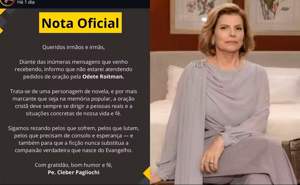 O padre Cléber Pagliochi, de Chapecó, no Oeste de Santa Catarina, precisou publicar uma nota oficial em suas redes sociais para esclarecer um mal-entendido inusitado: ele não irá atender aos pedidos de oração pela alma de Odete Roitman, personagem interpretada por Débora Bloch na novela Vale Tudo.