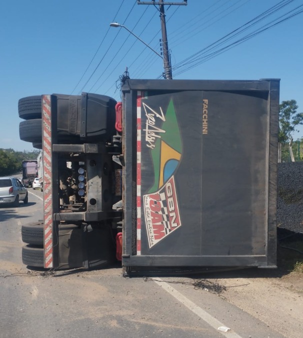 De acordo com as primeiras informações, o motorista de uma carreta perdeu o controle da direção ao fazer uma curva e o veículo acabou tombando na pista. Dentro da cabine estavam o condutor, a esposa e o filho do casal.