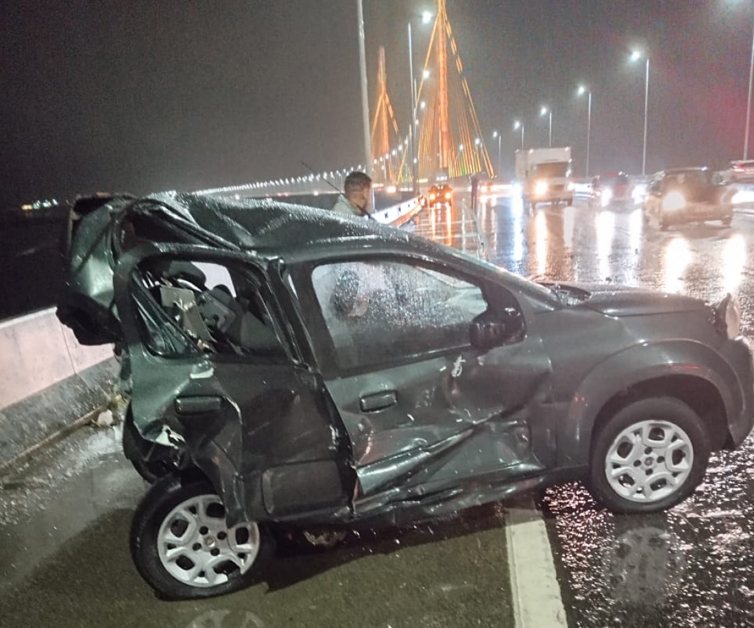 Carro fica com traseira destruída após acidente na Ponte Anita Garibaldi em Laguna